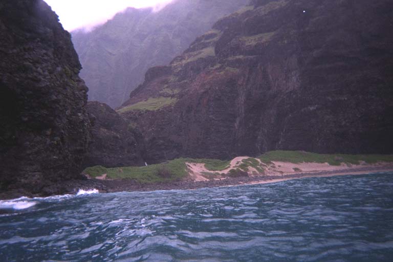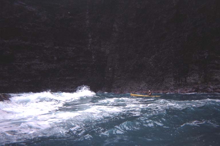 We had to stop at the Hanelai Bay office of Kayak Kauai to swap our leaky kayaks for better ones. When we got there, we found a message from Mike Malone. He had finally heard the weather report and was a little concerned about us. He recommended that we NOT land at Kalalau because we would not be able to launch in the morning. He recommended going to Milolii Beach and camping there. He recommended paddling back north to Kee Beach the next morning instead of continuing on to Polihale Beach. Polihale is reputed to have murderous surf this time of year, even on a mild day. These recommendations were the safe thing to do, the prudent thing to do, the conservative thing to do. They also violated the regulations and our permit.