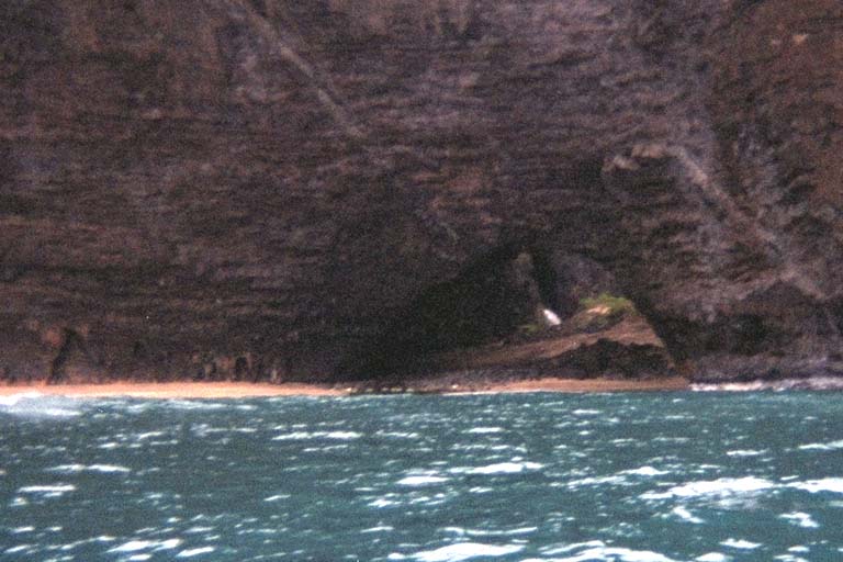 From this point on, we were traveling territory that I had not seen yet. We soon got to Kalalau Beach and looked it over from the water. The waves were rough and we figured that we could land here but might get dumped in the process. We had a few choices here: 1) We could land and explore the nearby trails until dusk then camp legally using our permit. The next morning we could paddle southwest and look into the rest of the caves on our way to visit Milolii. 2) We could paddle down the coast now and explore the caves, paddle back to Kalalau to legally camp for the evening. 3) Or, we could paddle down the coast exploring the caves and camp at Milolii like my local informant recommended. Jamie's argument was that we should go look for more caves while the weather was still good for it, so we headed south. This turned out to be a great suggestion, since we ended up going through five more caves and had a great time. The weather the next day would have prevented us from doing this.