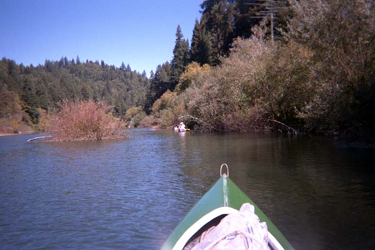 I wanted to clean my favorite section of the river down by Jenner, but I was "assigned" to the Monte Rio area. The rules included meeting everyone in Guerneville (five miles farther from home for me) to fill out waivers, meet our group leaders, get passes to the BBQ, wait around for an hour for everyone to show up, wait for them to get organized, and hear an orientation talk. Then we were allowed to drive single-file to the Monte Rio Beach and spend another half hour getting organized there and getting another orientation. I was in my partially-canopied two- person Kevlar canoe. Sitting in the back seat of this boat with nobody up front, the prow rose way out of the water. I figured 200 LBs of garbage could fit in the front and meanwhile I felt very maneuverable on a calm day on the river.