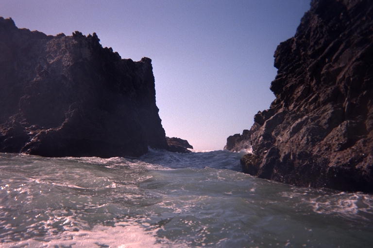 There is a big rock off the north side of Duncans Point, called the Hogback, which has a long narrow crack, only 4 meters wide, through the middle of it. I stopped to look at this crack from the road before I got in the water. The only reason for trying to go through this crack would be for the thrill of the ride. If I cannot go surfing, perhaps I will paddle through this crack. It looked calm enough, so I put on the full wetsuit, got in the water, and paddled around the point to look at it from the sea. There is a narrow space between the point and the Hogback that has a rough little beach on it, perhaps ten meters wide. The waves in this space were choppy, but I was safely able to paddle in and sit in front of the crack through the Hogback. I watched the waves for a while.