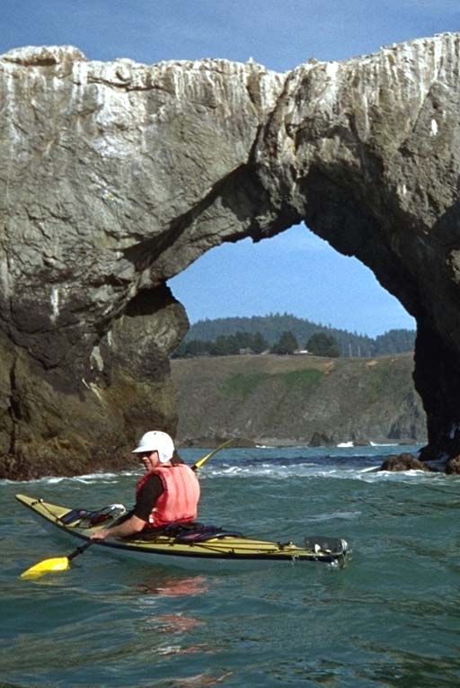 Hans originally said that he would go through the big Goat Rock Beach arch, until we got there and looked at the conditions. Roger said that he had no desire to go through there today. I replied that of course I had the desire, but that didn't mean I would risk it. We sat there for a while and watched some really big sets of waves go through and some large walls of breaking water slosh back and forth. Eventually I saw a calm set of waves and decided to zoom through. Half way under the arch I could tell that my timing was good and I slowed down to enjoy the view. Then I discovered that I was blocking traffic as two other kayaks came up behind me. Watching me start in had changed everyone else's mind and they all decided to go for it anyway. After this we turned back to Duncans Landing.