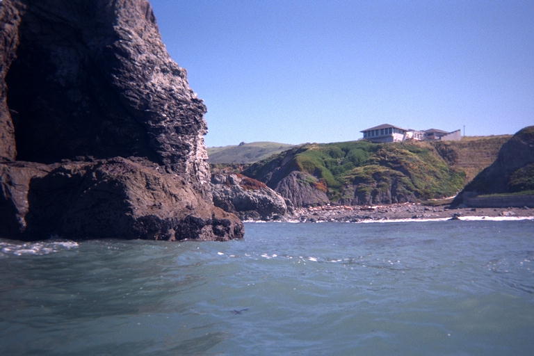 I passed a group of fishermen standing in the surf at Duncans landing. They were casting nets for surf fish, probably for bait, and had poles with long lines cast over the surf. As I left them to travel along the inside of the point that creates the cove, I found another colony of cliff swallows. Behind the point like this, I was in a wind shadow and I finally started feeling reasonably warm. From this point on, I didn't notice the cold any more. At the very tip of the point, I braved the choppy water and breakers to go between a rock and the shore. A friend of mine, Paul Futcher, complains that none of my pictures ever show very rough water (he is a white-water river kayaker). As I paddled out behind this rock through very choppy water with breaking waves, it occurred to me that this would make a picture that Paul would not scoff at. But when the water is rough, I'm too busy to deal with the camera! So I still have no "rough water" pictures to show Paul.