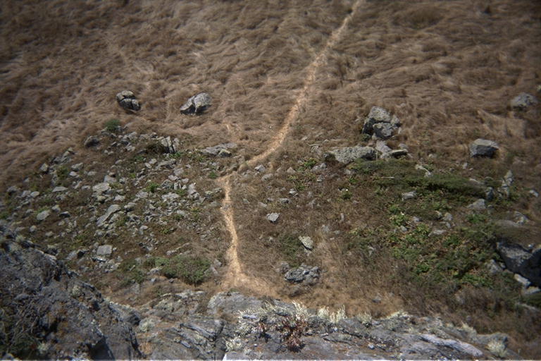 There was a group of people on top of the 'stub', so I walked around it once and on to a place to stand on the cliffs above the water for a few minutes. Even with 6 or 7 foot swells, it looked like there were some accessible places along the shore. I think I paddled past here once a long time ago, but it looks like a place I could explore again with the kayak one day when I don't feel like a long drive to a new place. Before I headed back, I saw the previous party descend, so I climbed up to the top of the 'stub'. Every time I have walked past here with Marty, doing things like climbing to the top of a 20 meter volcanic plug is totally out of the question. If I stop for things like that, Marty will leave from boredom waiting for me, or will leave to avoid having to watch me get 'too far' off the ground. Marty does not like heights, and claims to have seen my life flash before her eyes when I simply leaned down a flight of stairs. Without having to worry about the effect on Marty, I ran right up to the top of the 'stub'. There is a trail starting on the west side. It goes up a short talus to the vertical face, then curves around the south side and up the edge of the big talus in the back. You have to climb up a few steep rocky places, but eventually the beaten path curves around until you are facing west, and standing on top of the vertical face directly above where you started.