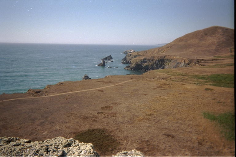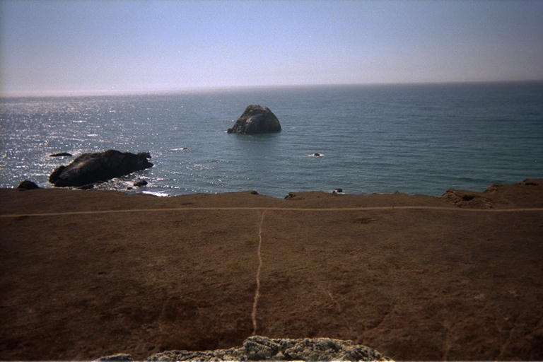 The next morning, Wednesday, the waves were too rough to do the Point Reyes trip, and getting worse. I probably could have survived it, but the northern most point of Point Reyes looks like a beautiful stretch with 120 meter cliffs dropping into water full of large rocks to paddle between. I decided to save it for a calmer day and aborted the trip. In retrospect, I could have gone out Tuesday evening, since I didn't need the wetsuit on Wednesday. On Thursday the waves were even higher, in preparation for a mild storm on Friday. I worked inside all day Thursday, and went out to get some exercise and see the sunset in the evening. I went to Goat Rock Beach again, and ran down the Kortum Trail to try to watch the sunset from the top of the 'stub'. The sun went behind a row of clouds as I walked down the trail, and cast some beautiful red-orange beams under the clouds onto the ocean. Even these beams disappeared by the time I made it to the top, and I ended up missing the sun completely from the top of the rock. But as I sat up there and caught my breath, the view was still worth the trip. The ocean was very rough, with a strong wind blowing up whitecaps. Just around the next point to the north, I could see my old friend the Arched Rock at Goat Rock Beach. Perspective made the difference between the edge of the bluff and the water seem like a very short drop. The flat grasslands between the rock I was on and the edge of the bluff looked like a well manicured lawn from this height.