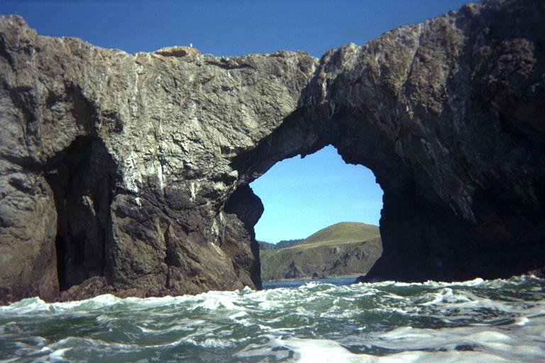 Of course, there's no way that I can get within several kilometers of the arched rock at Goat Rock Beach without paddling through it. It was rougher inside than I expected from 3 foot swells, but I took my time and enjoyed it. There was no real danger of being dumped over by the waves, but probably a lot of danger of me falling out while twisting around to take some pictures. I just went through it once, east to west, and then turned north back towards Russian Gulch.