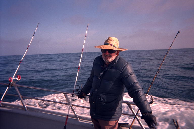 Russell, Marty's dad, is an avid fisherman back in Harrold Harbor (near the Chesapeake Bay) in Maryland. So Marty suggested that I take him fishing while he was visiting. She made reservations for us on "Jaws", a sport fishing party boat out of Bodega Harbor. We had to get up at 4:00 am Sunday morning to get there in time to get aboard, only to discover that Marty had told us the wrong time to make sure we got there before they left. We were an hour early! We stopped at the little store and restaurant on highway one that has the "Jaws" sign on it. Someone was just opening up, but got out about $15 dollars worth of equipment (each) that he said we would need for the trip. Then he gave us directions to the boat, and told us we would have to stop at another store down by the water to get Russell a fishing license. On the trip down, I began to fear that this guy had nothing to do with the boat, but had just made $30 off of two gullible tourists. But when we got the license and went to the boat we found out that we did have the correct expendable pieces of equipment that they do not supply; leaders, hooks, lead weights, and a gunny sack to take home all the fish we were going to catch. I still think we paid too much for them.